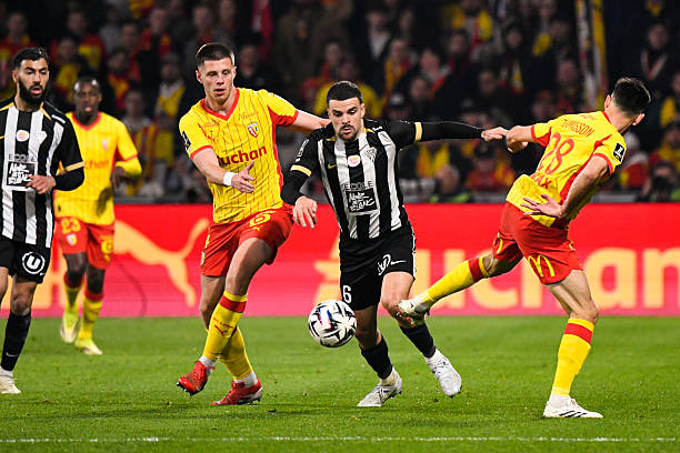 Louis MOUTON of Angers and Nidal CELIK of RC Lens and Adrien THOMASSON of RC Lens during the Ligue 1 McDonald’s match between Lens and Angers at Stade Bollaert-Delelis on March 20, 2026 in Lens, France. (Photo by Ewen Gavet/Icon Sport via Getty Images)